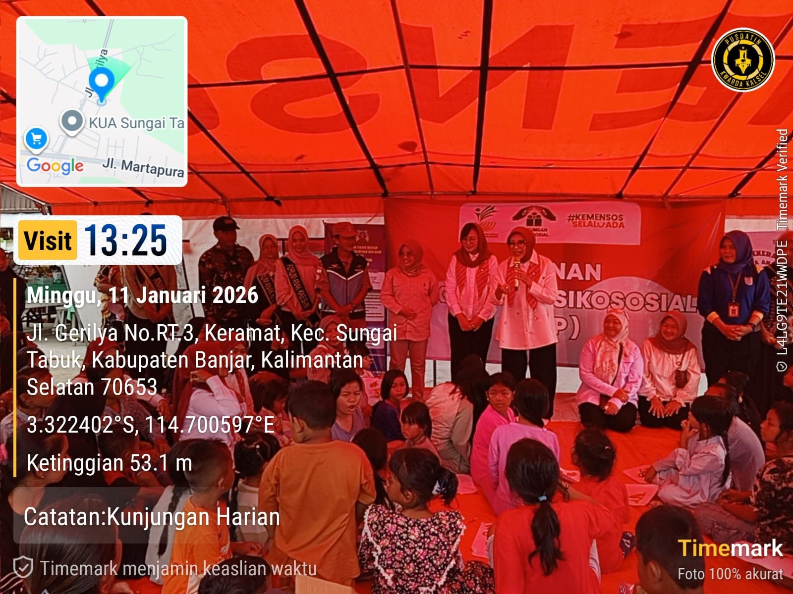Pelaksanaan kegiatan trauma healing pasca bencana tersebut juga sempat disambangi Wakil Menteri Perlindungan Perempuan dan Anak (Wamen PPPA) Veronica Tan yang didampingi isteri Menteri Sosial Fatma Saifullah Yusuf beserta rombongan, Minggu (11/01/2026). Selain bercengkaram dengan anak-anak penyintas korban banjir di Sungai Tabuk, Kab. Banjar tersebut Veronica Tan dan Fatma Saifullah Yusuf yang juga tentunya ibu rumah tangga, juga menyempatkan membantu pelaksanaan dapur umum yang ada di posko bersama dengan petugas dan relawan lainnya.